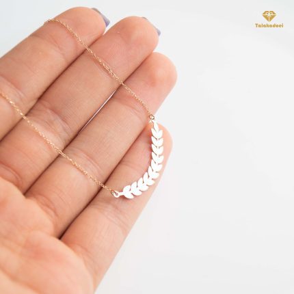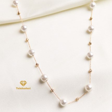 گردنبند مروارید یک نمونه منحصر به فرد از طرح های طلا و مروارید است که در آن چینش زیبای مرواریدها بر روی زنجیر طلا شکوه هنر طلا و جواهر سازی را بیشتر به رخ می کشد. گوی های ریز البرنادو بر روی زنجیر آن را زیباتر و خاص تر کرده است. استفاده از این گردنبند در مجالس توصیه گالری طلا کادویی به شما می باشد. استفاده از این گردنبند با لباس های یقه باز هفت بسیار زیبا جلوه می کند.طول این گردنبند 45 (سانتی متر) می باشد و 18 عدد مروارید پرورشی با ظرافت بر روی آن کار شده است . وزن گردنبند بدون مروارید محاسبه شده است.