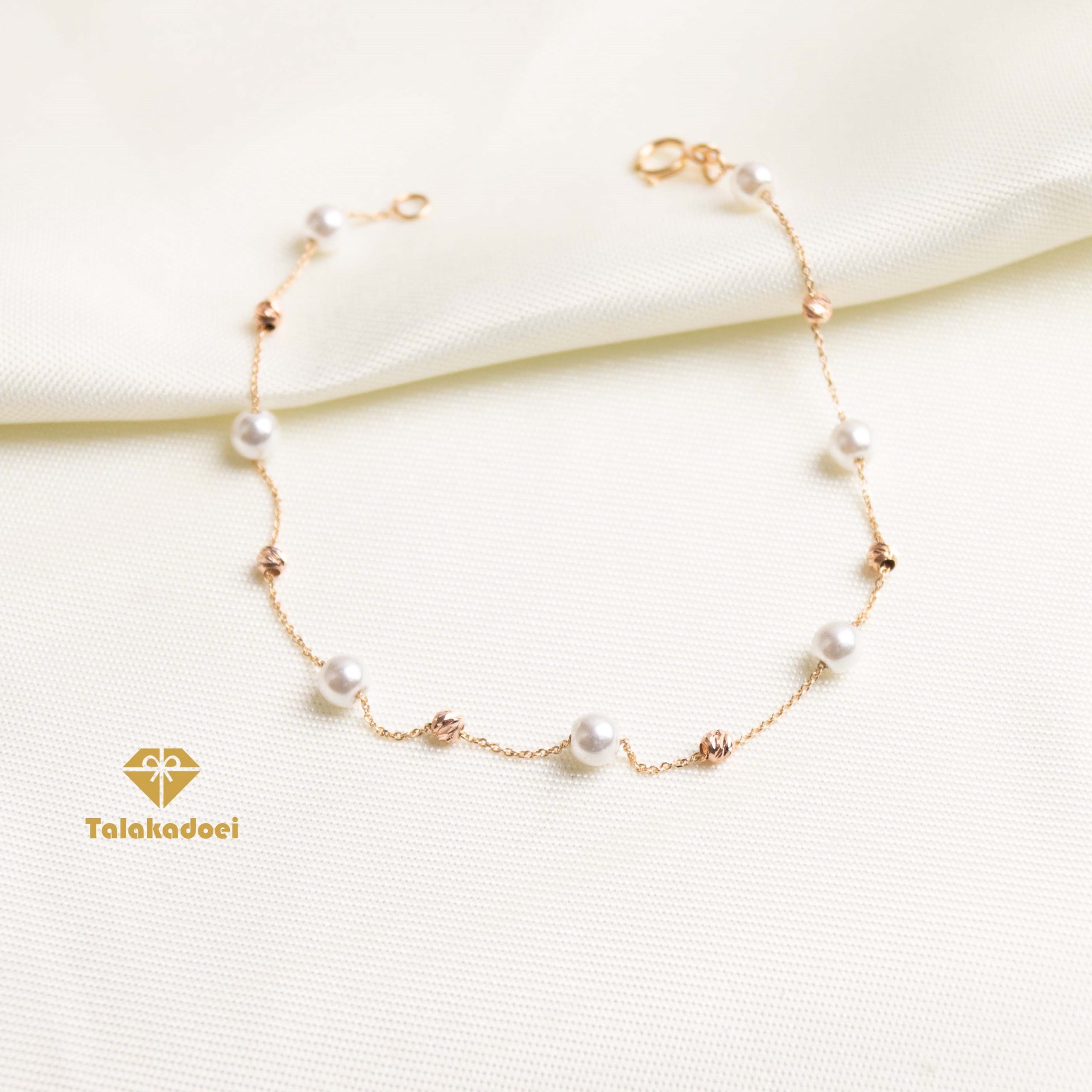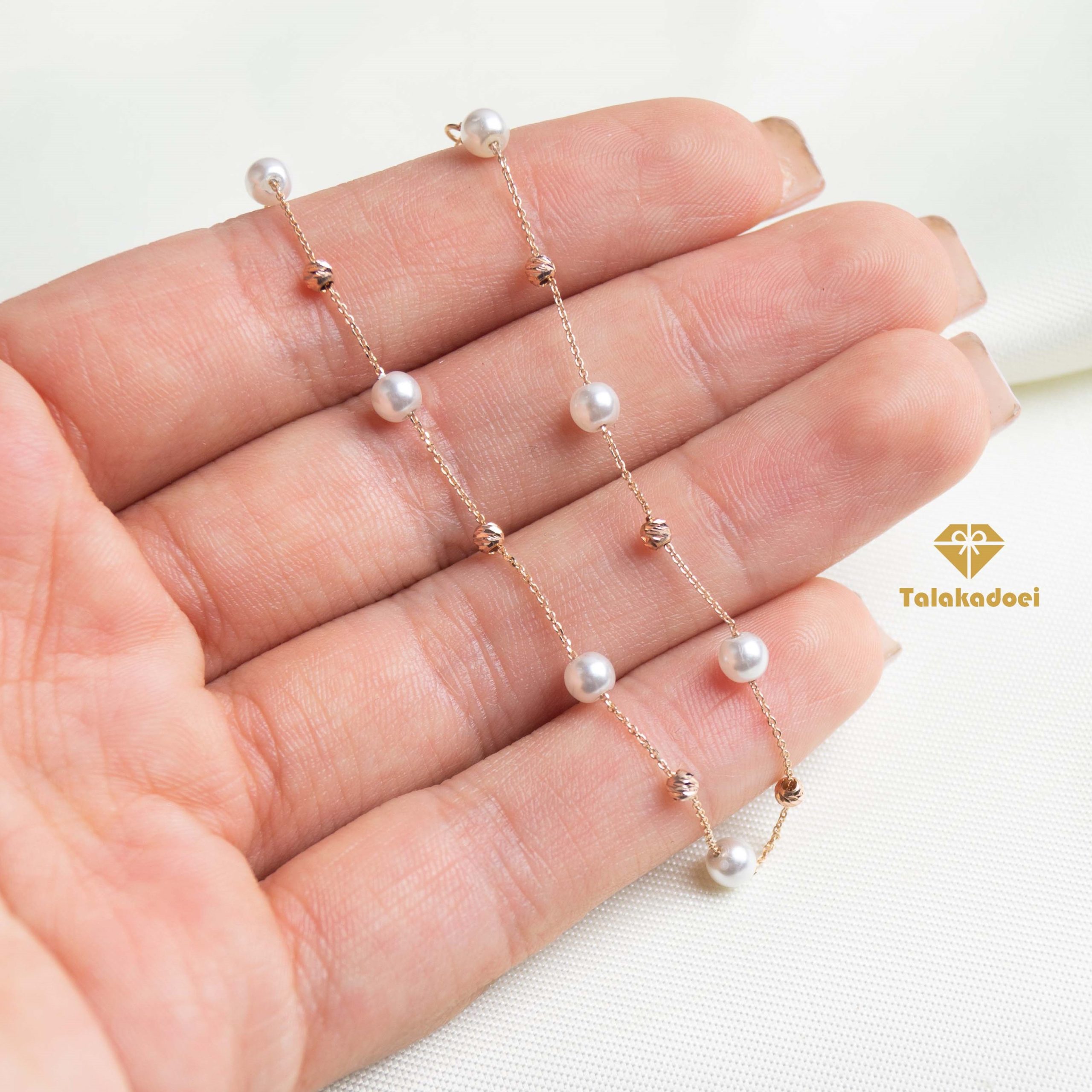 در این پست شما دستبند طلا مروارید را مشاهده می کنید که از تعدادی مروارید و گوی های البرناردو تشکیل شده است. گوی البرناردو به خاطر تراش هایی که دارد باعث بازتاب نور می شود و جلوه نگین را به این دستبند طلا می بخشد. مروارید شل بکار رفته در این مدل دستبند طلا دخترانه در اثر برخورد به مواد آرایشی بهداشتی تغییر رنگ ندارد. از ویژگی های این مدل دستبند طلا جدید نمای فوق العاده و زیبا به نسبت قیمت مناسب آن است که باعث شده تا بسیار پرفروش باشد.